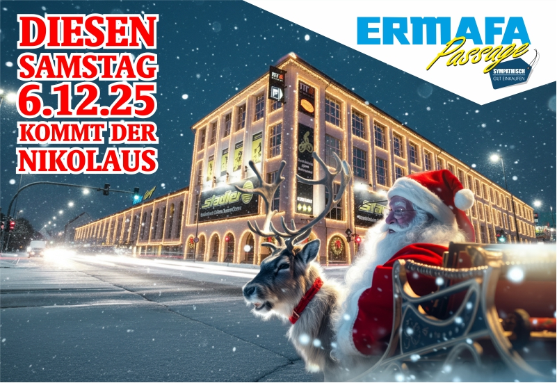 Der Nikolaus kommt! Am Samstag, den 06. Dezember kommt der Nikolaus wieder in die ERMAFA-Passage.Von 16:00 bis 18:00 Uhr können die Kleinsten wieder vorbeikommen und sich vom Nikolaus überraschen lassen. DetailsDate:1. Dezember 20251. Dezember 2025Categories:Veranstaltung